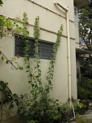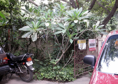 The champa has delighted us with her growth and flowers. The area around has become a bit wild with the money plant and the weeds in our long absence. Check out the picture from about two years back.