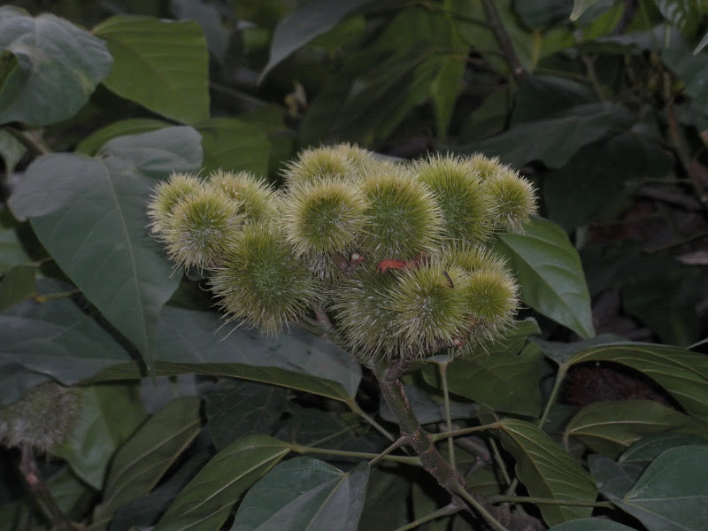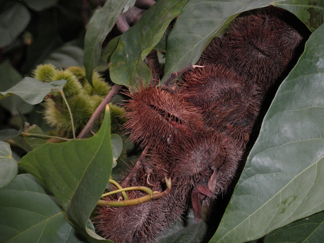 Thank you readers, for identifying this tree! I wonder what led to its common name - the lipstick tree! Perhaps the fact that the seeds of this tree are used to obtain a yellow orange dye, which is used as a colorant in foods - rice and cheddar cheese.