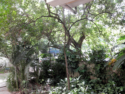 The lemon tree, barely visible amidst the front garden overrun with the singonium, weeds and the king palms.