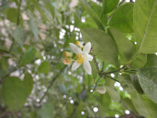I've never noticed flowers on the lemon tree all these years. This time though i spotted one -- it is the kind that faces the ground, but i managed to crawl under and take a picture.