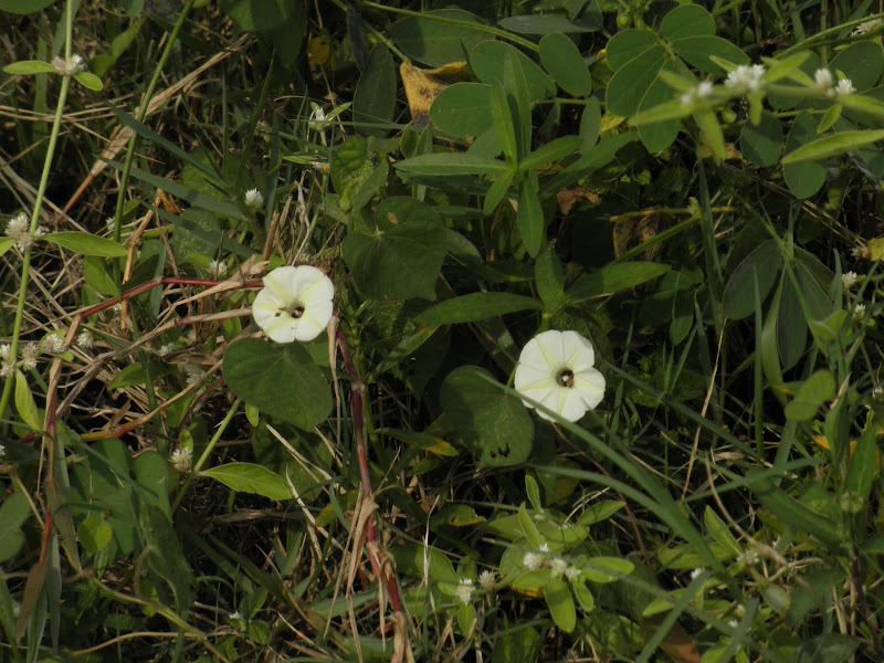 Lots more ipomoea varieties. This one is probably the Marsh Glory (Ipomoea aquatica). Kehimkar has some interesting things to say about this one in his book - Common in marshy, water-logged places. A trailing runner with hollow stems that float and root at nodes. Caterpillars of Death's Head Hawkmoth and Glory Hawkmoth feed on this plant. The tender shoots are cooked and eaten.
